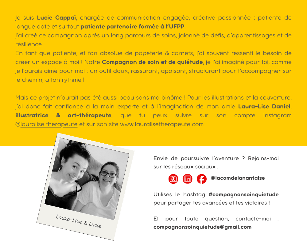C’est de ma dernière hospitalisation et de cette réalité qu’est né le Compagnon de soin & de quiétude. Un carnet pas comme les autres, pensé pour accompagner chaque étape de ton parcours, avec organisation, douceur et bienveillance.